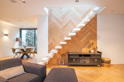 Light and bright L-shaped living room with oak wood herringbone floor, dimmable spotlights and built-in speakers.